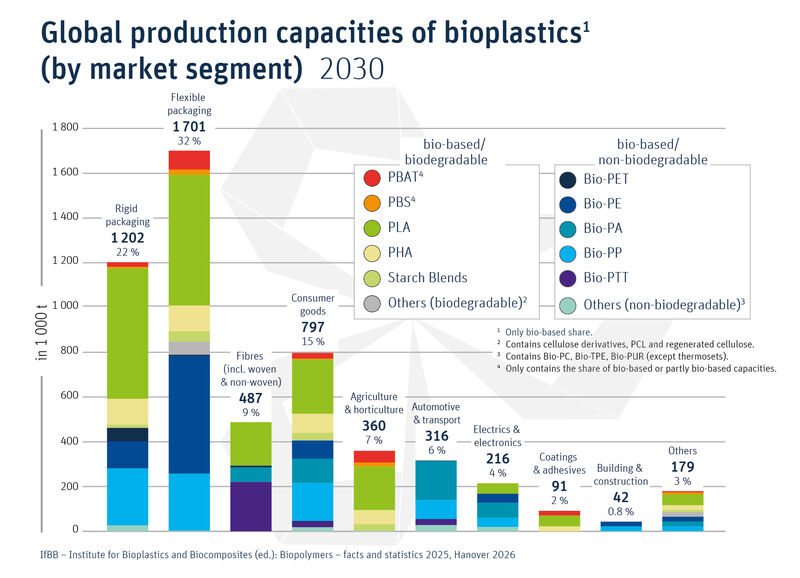 Global production capacities of bioplastics by market segment 2030