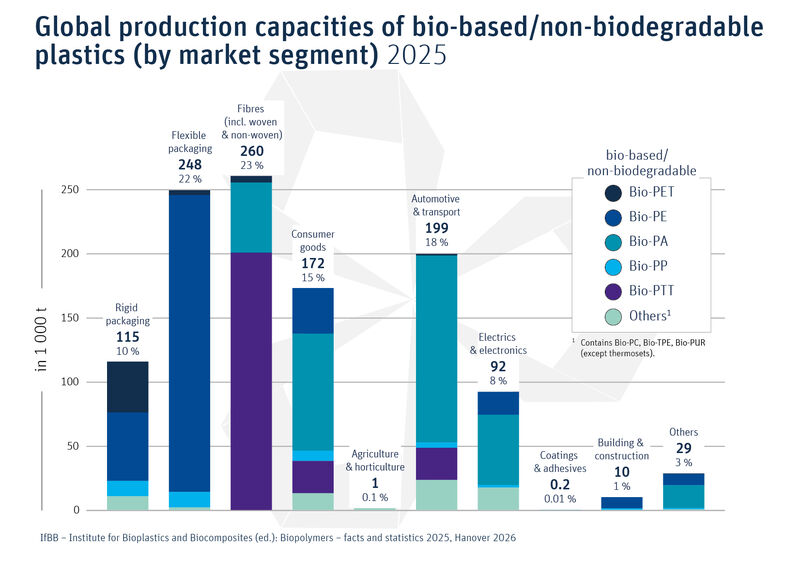 Global production capacities of bio-based/non-biodegradable plastics by market segment 2025