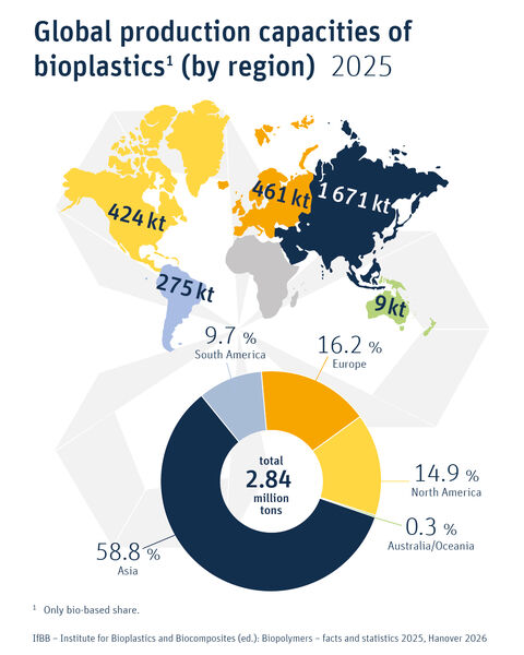 Global production capacities of bioplastics by region 2025