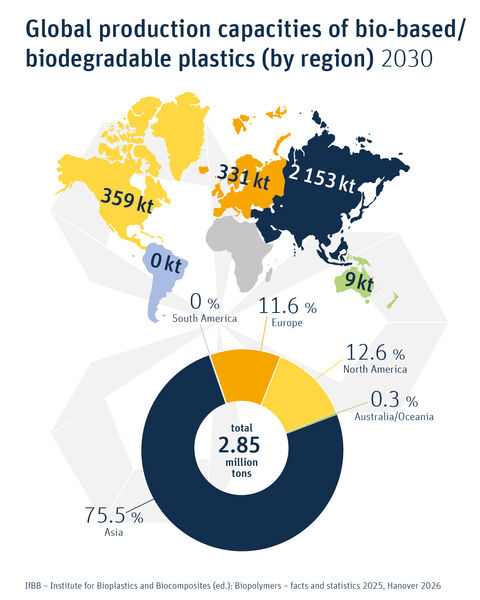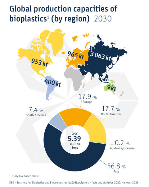 Global production capacities of bioplastics by region 2030