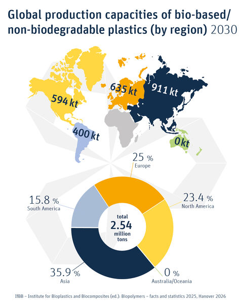 Global production capacities of bio-based/non-biodegradable plastics by region 2030