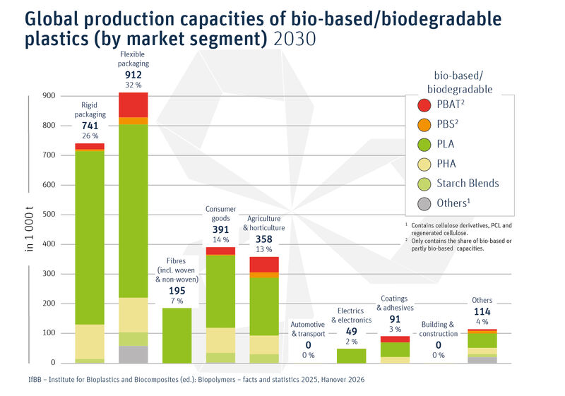 Global production capacities of bio-based/biodegradable plastics by market segment 2030