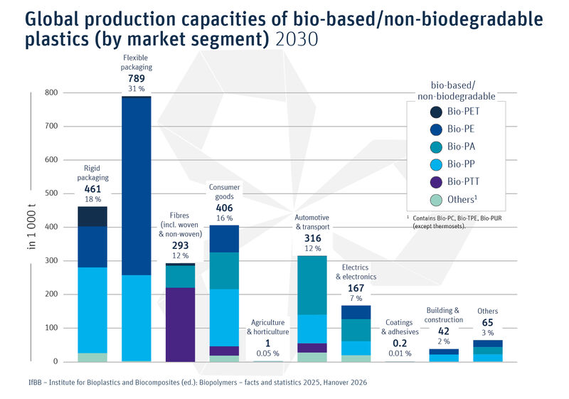 Global production capacities of bio-based/non-biodegradable plastics by market segment 2030