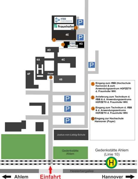 Vom Hauptbahnhof Hannover mit der Stadtbahn Linie 10 Richtung Ahlem bis Haltestelle "Gedenkstätte Ahlem" (Fahrtzeit ca. 17 Minuten). Hinter der Haltestelle an der Gedenkstätte vorbei rechts in die Einfahrt einbiegen. Nach ca. 150 m erreichen Sie einen großen Parkplatz, an dessen Ende Sie das IfBB finden.