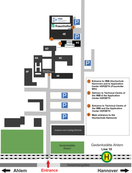 From the airport “Hannover-Langenhagen” by S-Bahn S 5 (Departure at Terminal C) to the central station Hanover (travel time about 17 minutes). From the central station Hanover by tram 10 direction “Ahlem” to tram station “Gedenkstätte Ahlem” (travel time about 17 minutes). Behind the tram station right across the tram tracks.